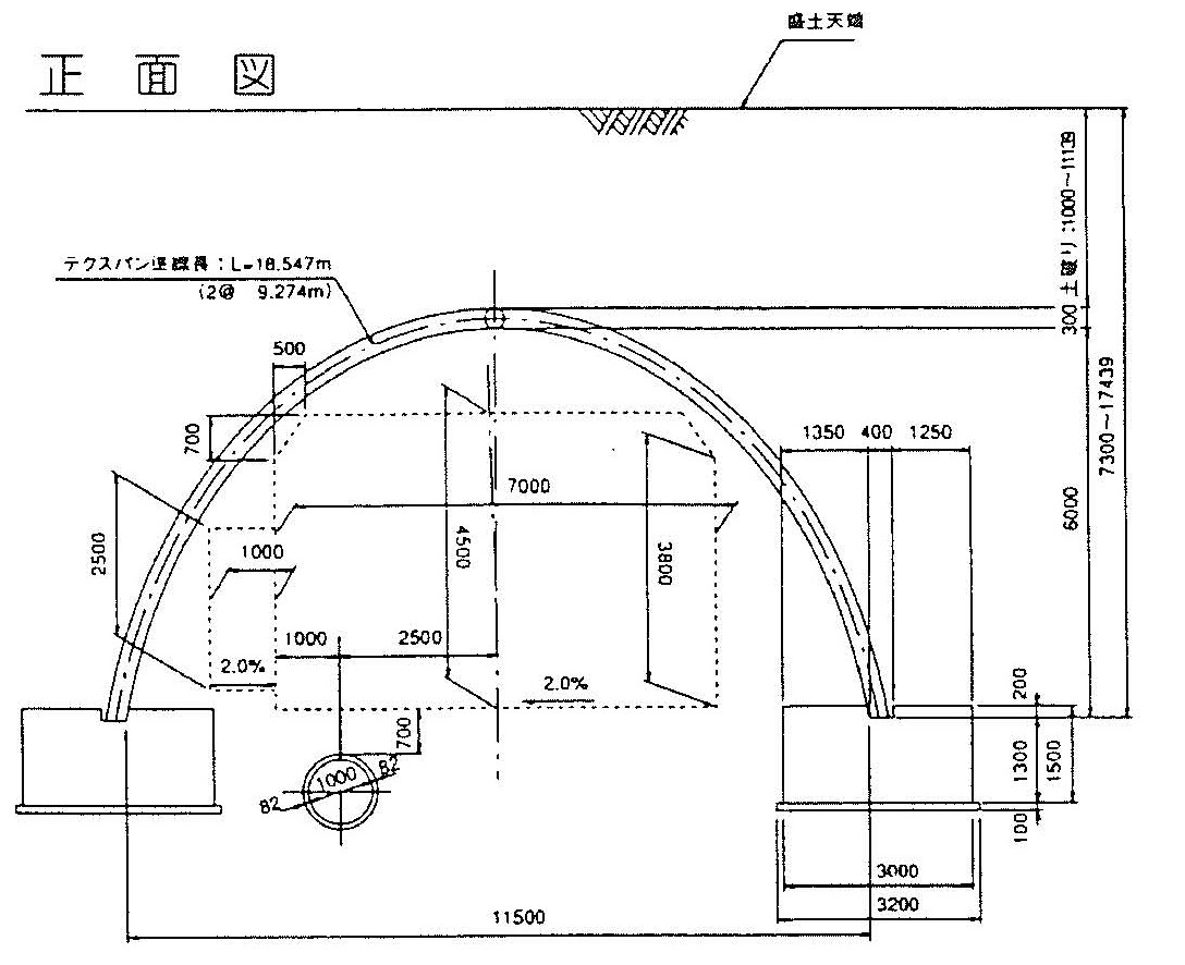 テクスパン工法とは,プレキャストヒンジ式アーチ工法のことであり,アーチ部材の基礎部とクラウン部にヒンジを有する3点ヒンジの静定構造物である。アーチ構造に懸垂曲線を採用することで,部材厚さを極力薄くすることができ,ヒンジを有することによりカルバートボックスなどのような剛構造物と異なり柔構造物であるため,盛土に対して微小に変化することができ,過度の応力集中を起こさないものとなっている。