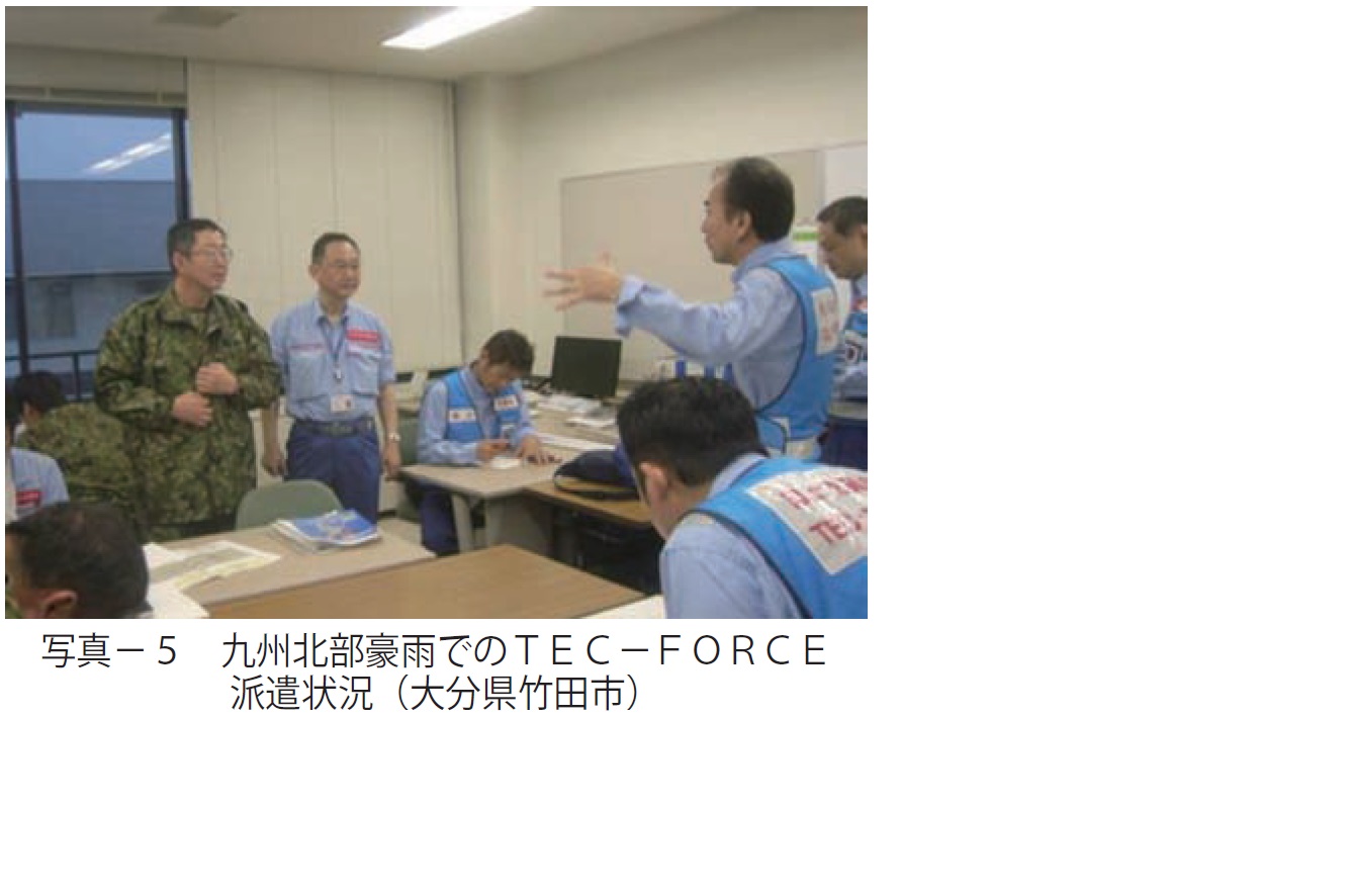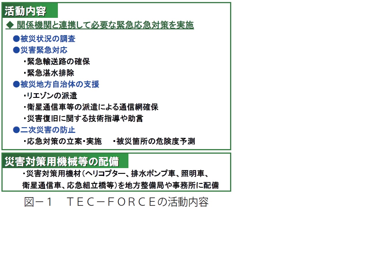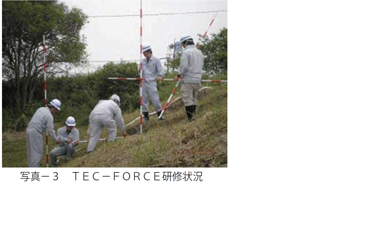 TEC-FORCE(テック・フォース)は、大規模災害時に、被災状況の把握や被災地方自治体の支援を行い、被災地の早期復旧のための技術的支援を迅速に実施するため、平成20 年に国土交通本省及び各整備局等で発足した。