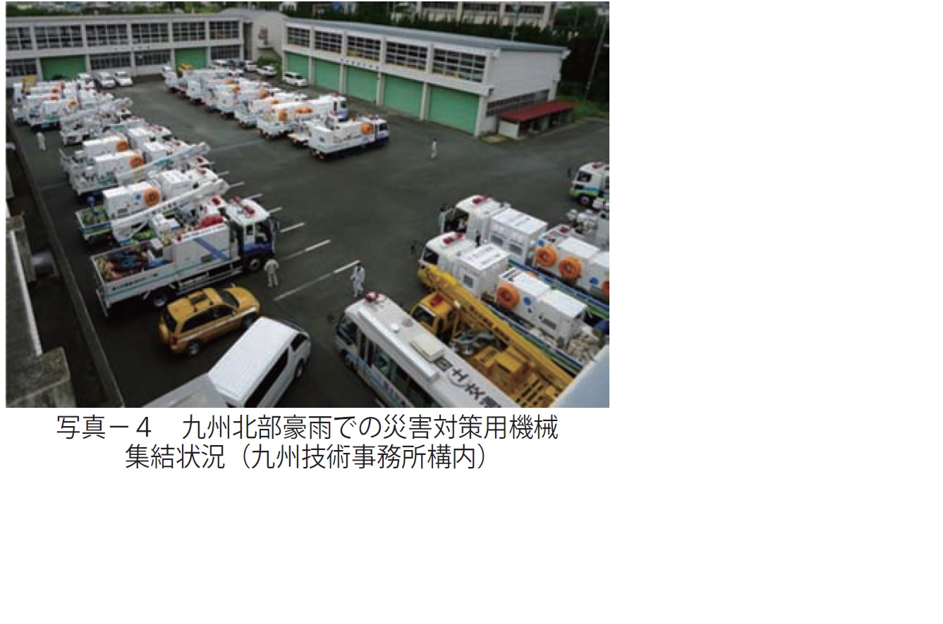 先の平成24 年7月九州北部豪雨においても、九州技術事務所と共に、これらの派遣拠点としての対応を行ったところである。(写真-4に整備局内及び全国からの機械集結状況を示す)
