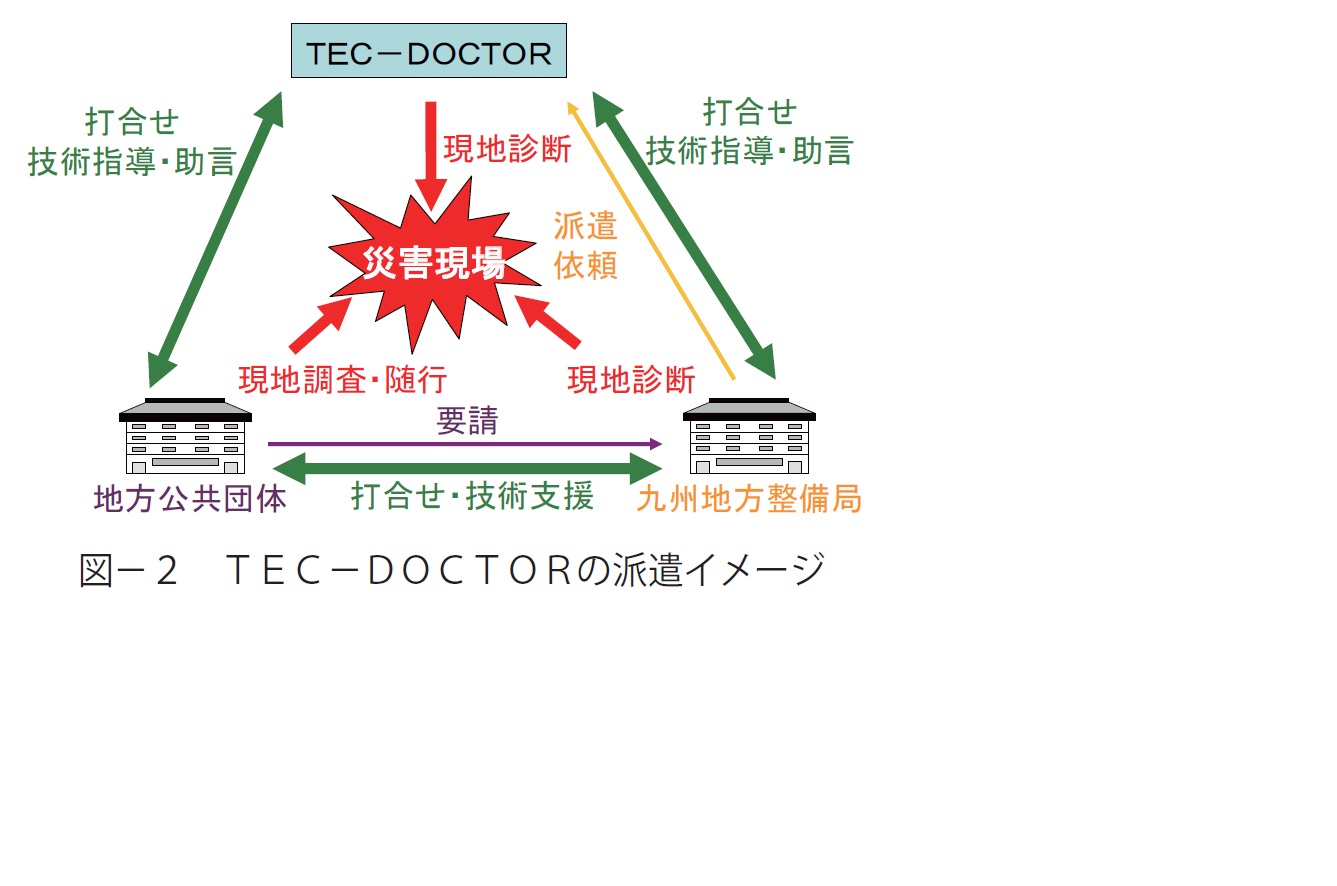 TEC-DOCTOR(テック・ドクター)は、九州管内の河川・道路・砂防施設等が被災し、復旧などで高度な技術や専門的な知識を必要とする場合に、学識経験者を被災地へ派遣し、技術的な指導や助言を受けるものである。