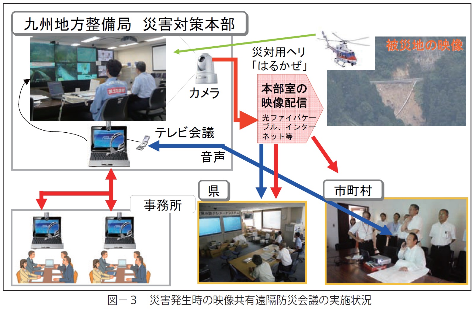 整備局では、整備局災害対策本部と被災自治体とで、テレビ会議システム等によりヘリコプターなどの現地映像を直接確認しながら災害対応にあたる、「映像共有遠隔防災会議」を行っている。
