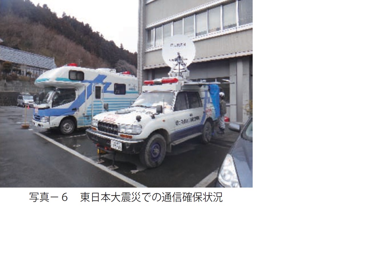 これらの機械・機器の殆どは、迅速な派遣が可能なよう九州技術事務所をはじめ、九州各地の事務所等に分散配備しており、これまでも九州各地の災害対応や東日本大震災等への派遣対応を行ってきた。東日本大震災での衛星通信車による自治体庁舎の通信確保状況を写真-6に示す。